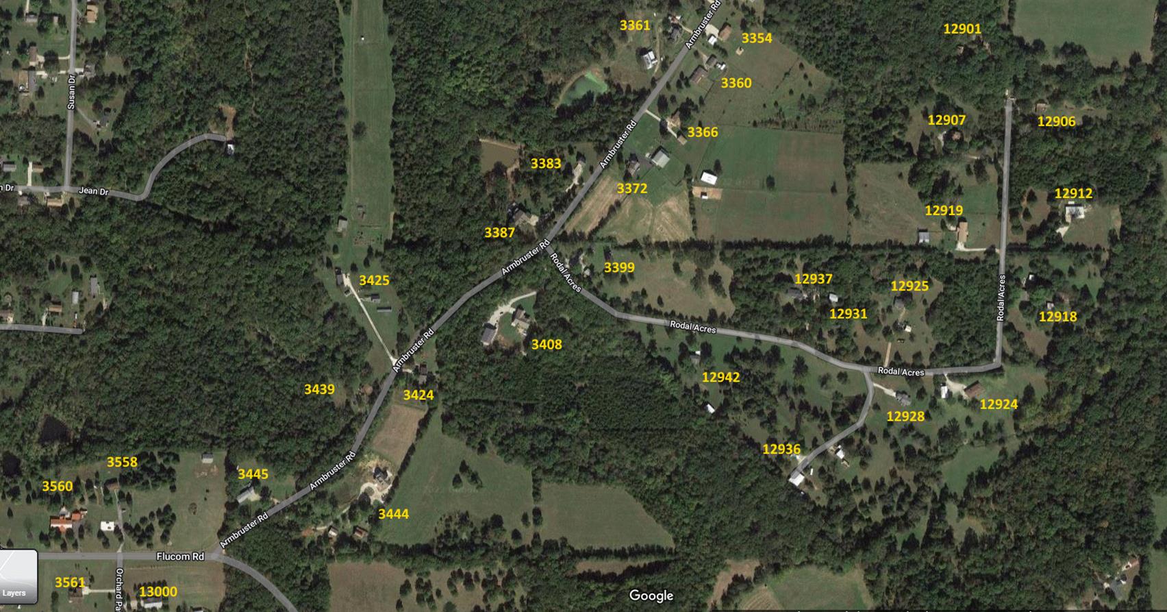 RIGHT ON SUNRISE SCHOOL RD TO STATE RD V. RIGHT ON STATE RD V TO US HWY 67. LEFT ON US HWY 67 TO FLUCOM RD. LEFT ON FLUCOM RD TO ATHENA SCHOOL RD. RIGHT ON ATHENA SCHOOL RD TO ARMBRUSTER