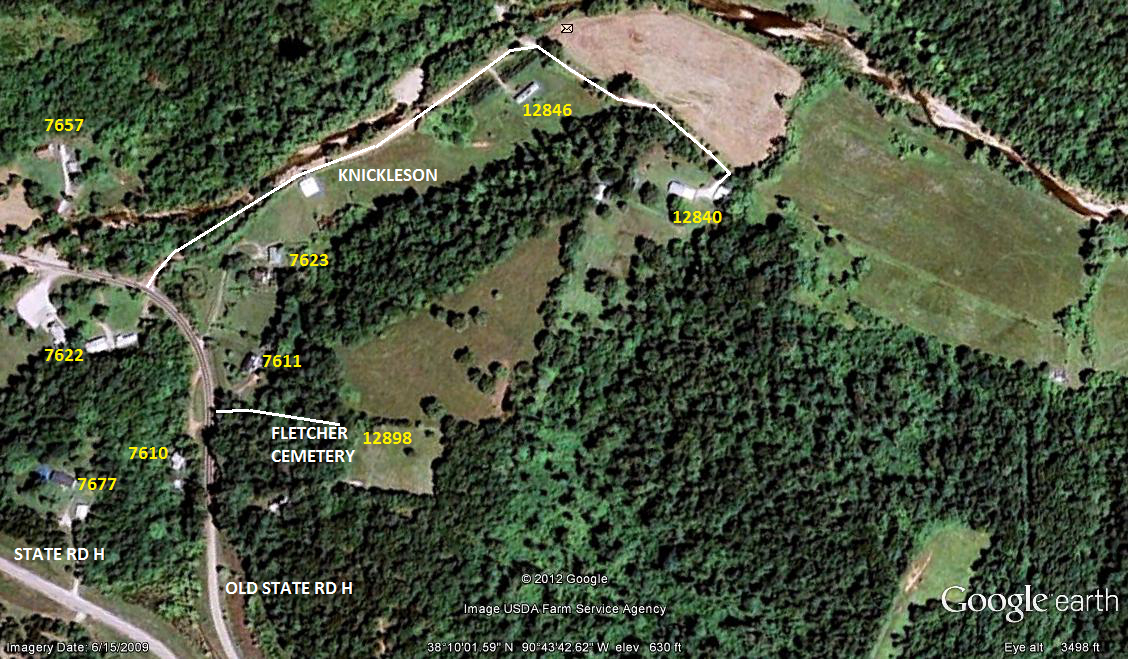 H. RIGHT ON OLD STATE RD H TO FLETCHER CEMETARY RD. RIGHT ON FLETCHER CEMETARY