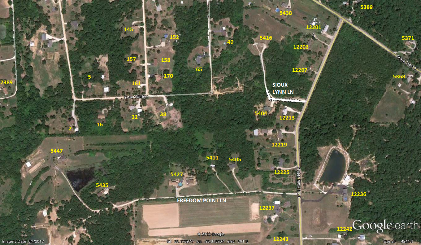 21. RIGHT ON STATE RT 21 TO STATE RD Y. LEFT ON STATE RD Y TO PETER MOORE LN. LEFT ON PETER MOORE LN TO FREEDOM POINT LN. RIGHT ON FREEDOM