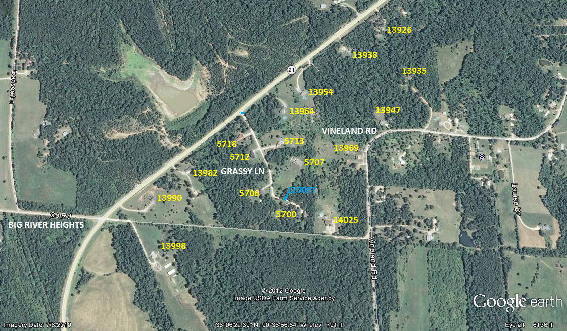 BIG RIVER HEIGHTS RD TO STATE RT 21. LEFT ON STATE RT 21 TO