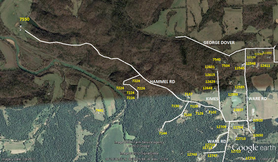 STATE RD H. LEFT ON STATE RD H TO WARE RD. RIGHT ON WARE RD TO HAMMEL RD. LEFT