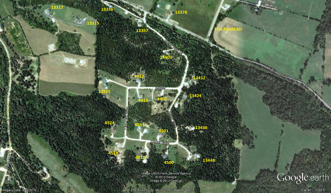 VALLEY VIEW DR TO MAPLE LN. RIGHT ON MAPLE LN TO LIVE OAK