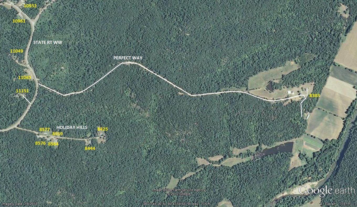 STATION FIVE - LEFT ON PERKINS RD TO STATE RT 21. LEFT ON STATE RT 21 TO BIG RIVER HEIGHTS RD. LEFT ON BIG RIVER HEIGHTS RD TO DODSON LN. RIGHT ON DODSON LN TO STATE RD H. LEFT ON STATE RD H TO STATE RD WW. RIGHT ON STATE RD WW TO PERFECT WAY. RIGHT ON PERFECT WAY