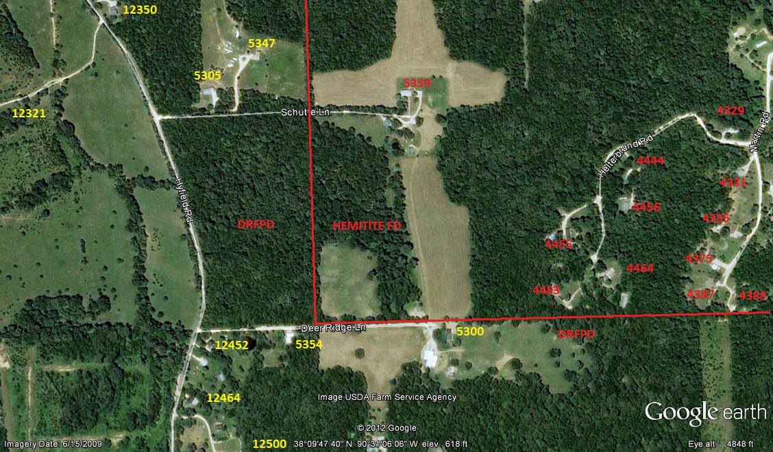 STATION FIVE - LEFT ON PERKINS RD TO STATE RT 21. LEFT ON STATE RT 21 TO STATE RT 110. RIGHT ON STATE RT 110 TO STATE RD P. LEFT ON STATE RD P TO HYFIELD RD. RIGHT ON HYFIELD RD TO SCHUTTE LN. LEFT ON SCHUTTE LN